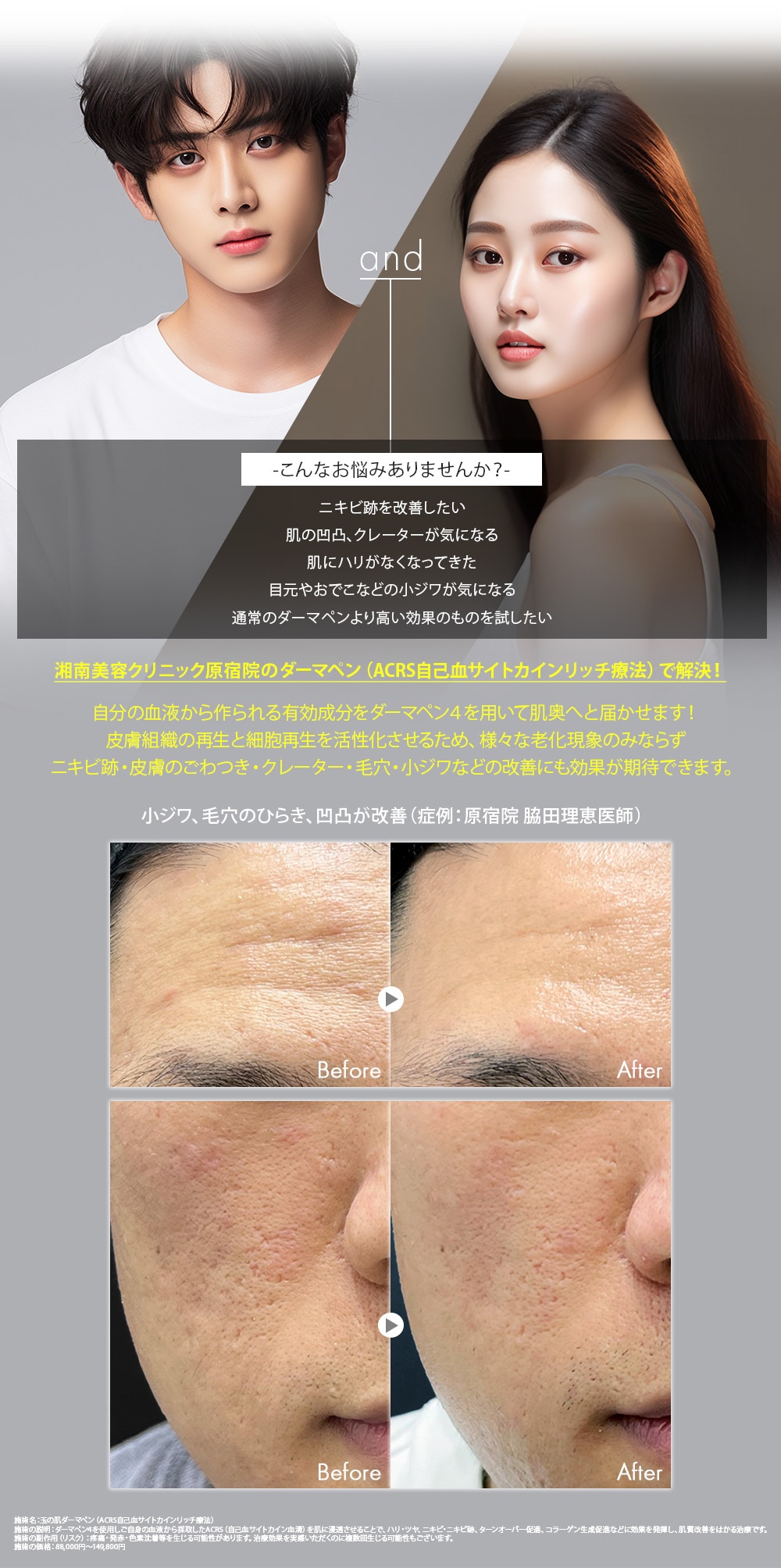 男女兼用!お肌のお悩み「クレーター」「毛穴」「小ジワ」「ニキビ跡」などのあらゆるお悩みには湘南美容クリニック原宿院の「玉の肌ダーマペン」