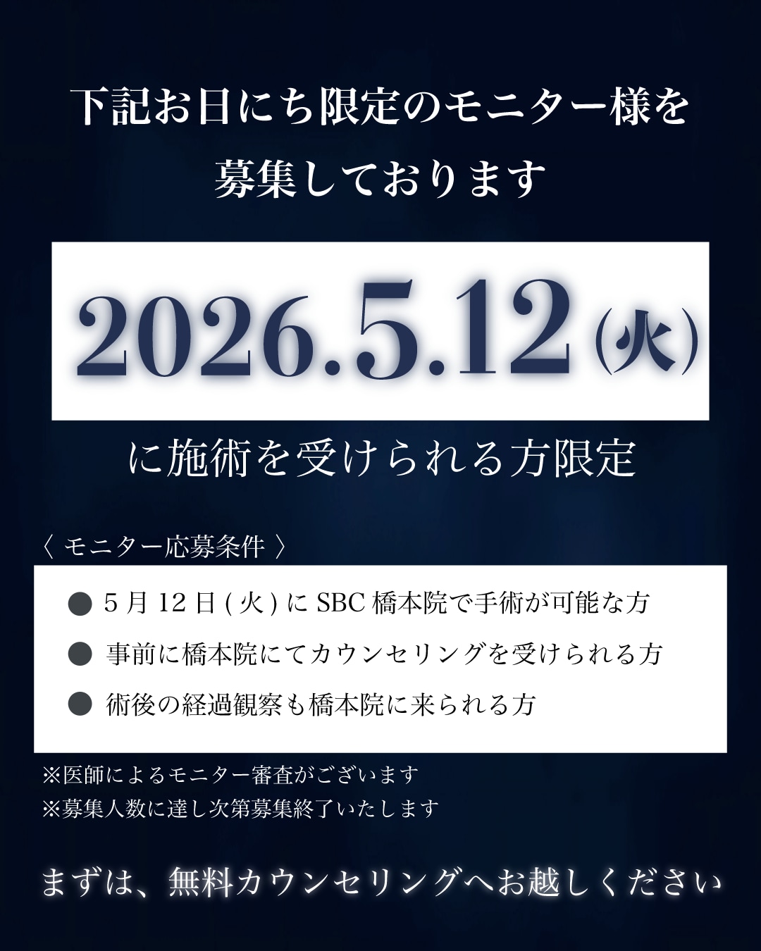 ・5月12日(火)にSBC橋本院で手術が可能な方