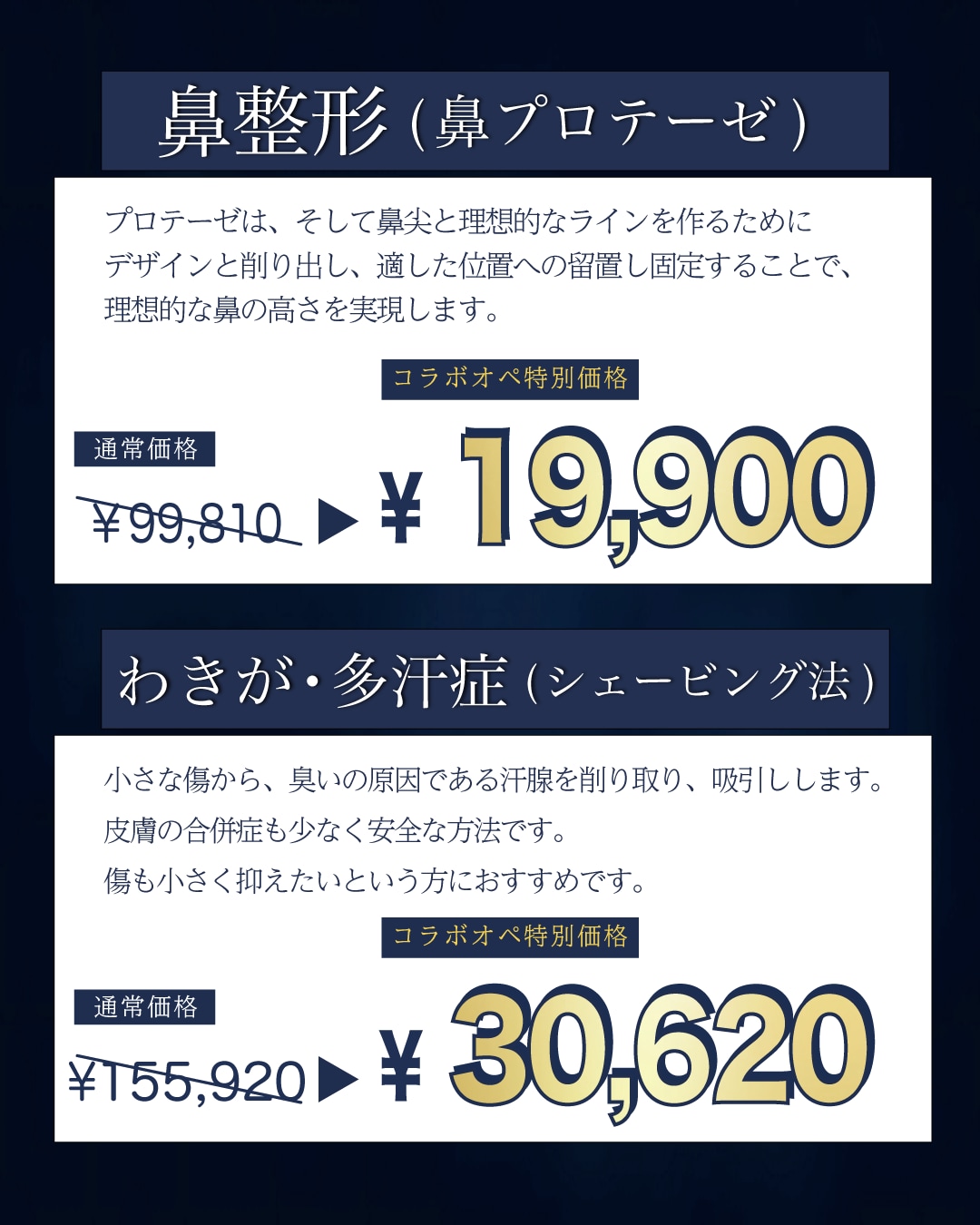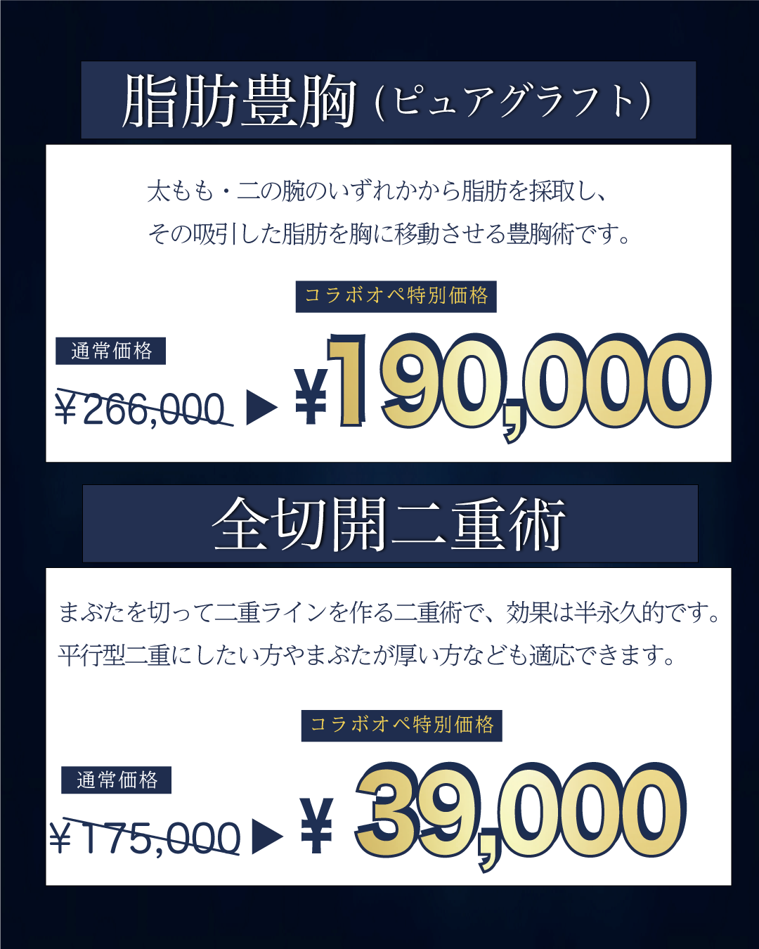 内容は「脂肪豊胸〜ピュアグラフト〜」「全切開二重術」「鼻整形」「わきが・多汗症」になります。