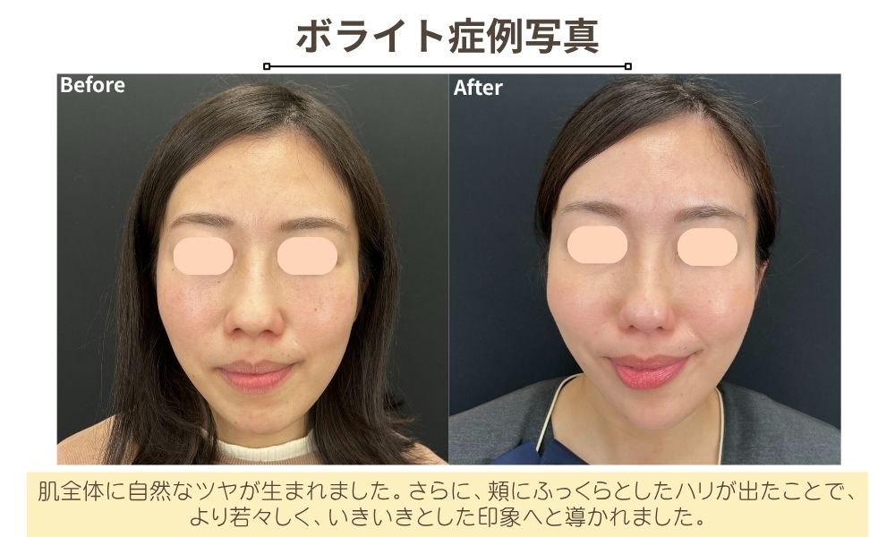 架橋型ヒアルロン酸であるボライトXCは1回の施術で約9ヶ月の保水効果が期待できます。
