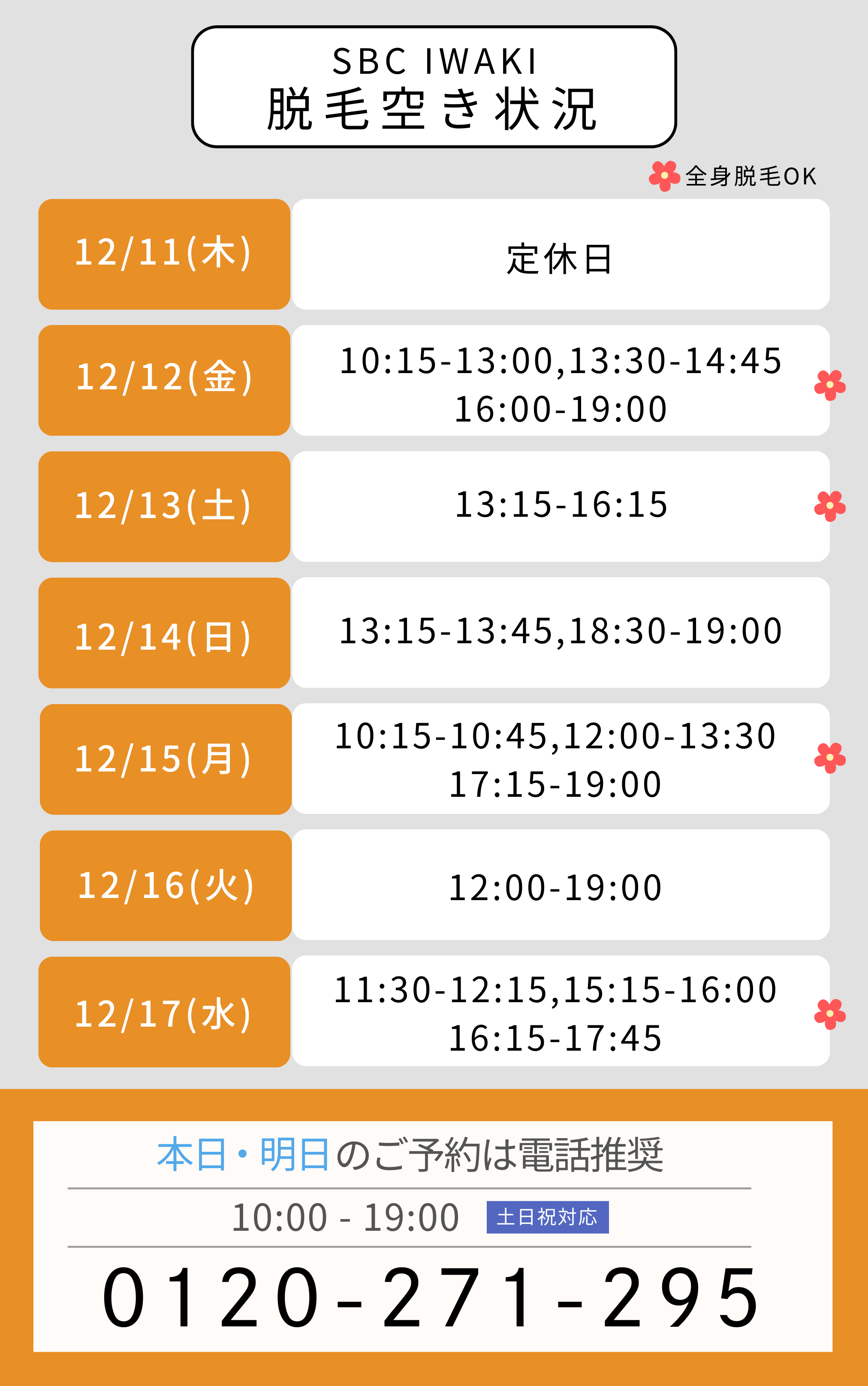【2025年12月11日時点】脱毛空き状況(全身予約可能◎)