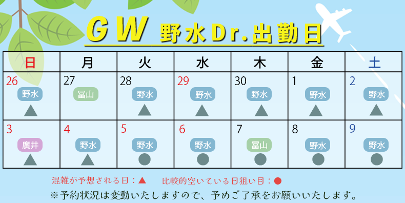【予約状況】 GW期間中は大変混み合いますので、お早めのご相談をお願いしております。