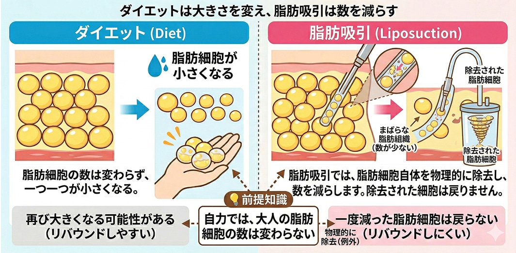 大人になると脂肪細胞の数は変わりません。一度取り除いてしまえば、その場所が再び以前のように太ることはほとんどなくなります。