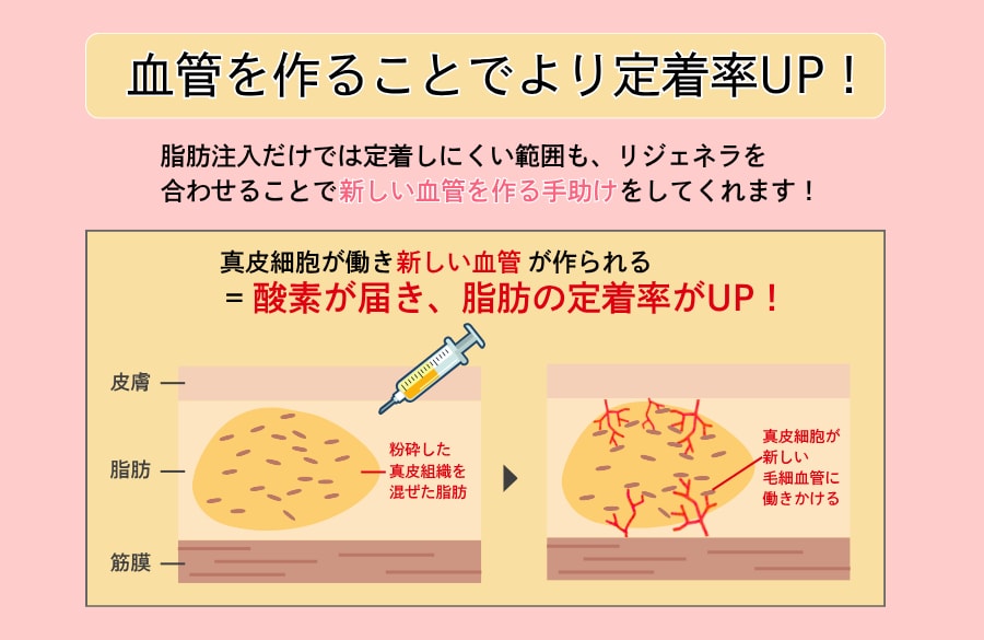 しかしリジェネラがあることによって、脂肪をつなぎ安定させ定着率を大幅にアップさせます。