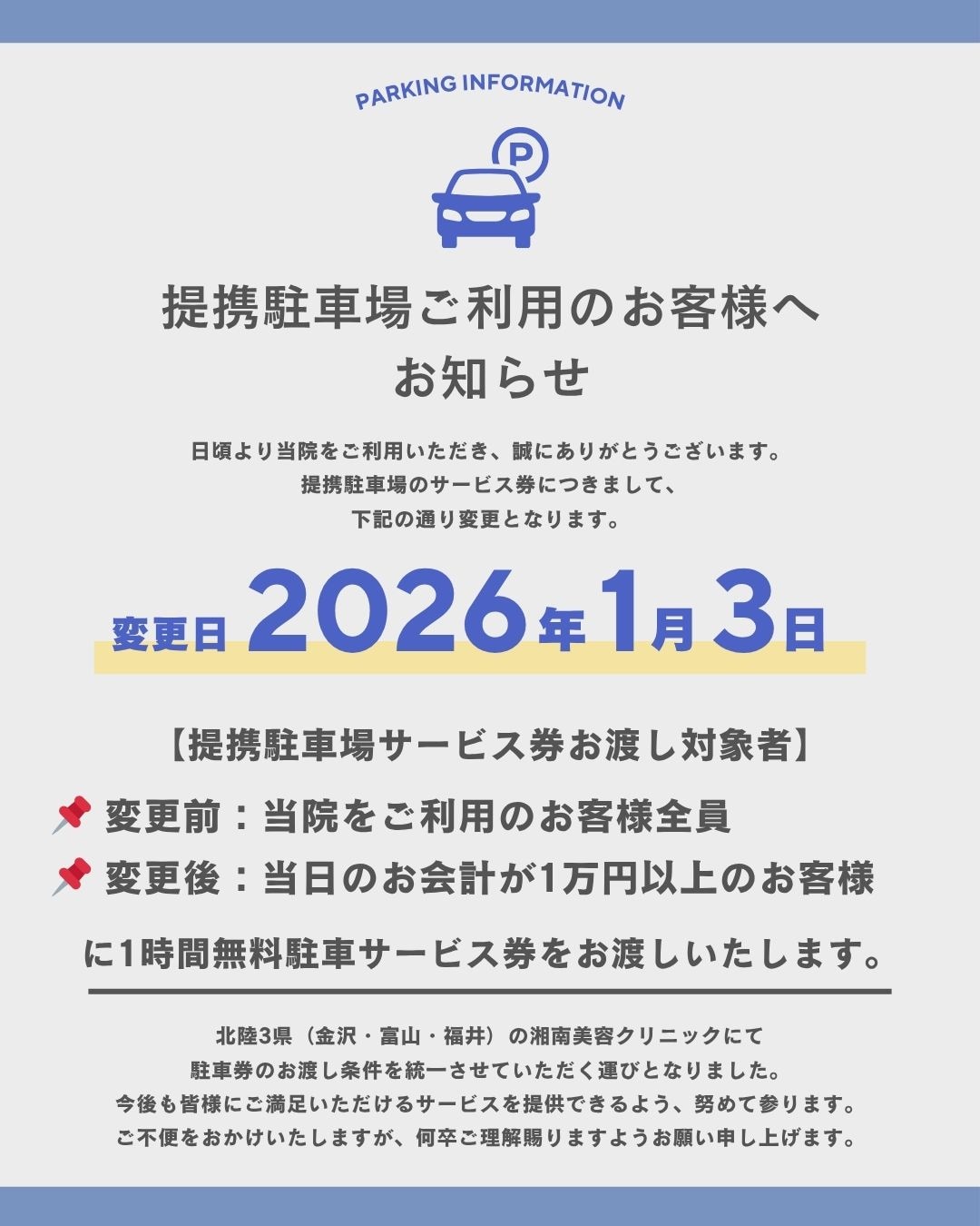 提携駐車場サービス券のお渡しに関して、2026年1月3日より変更となります。