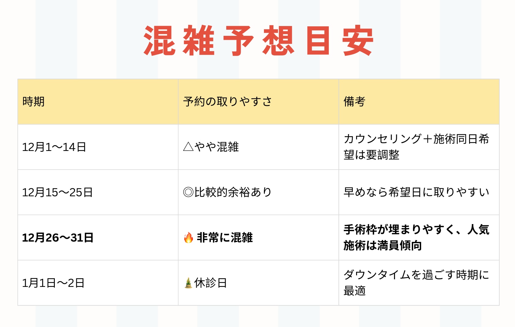 遅くとも12月初旬にカウンセリング・手術日の確定をしておくと安心です☺️