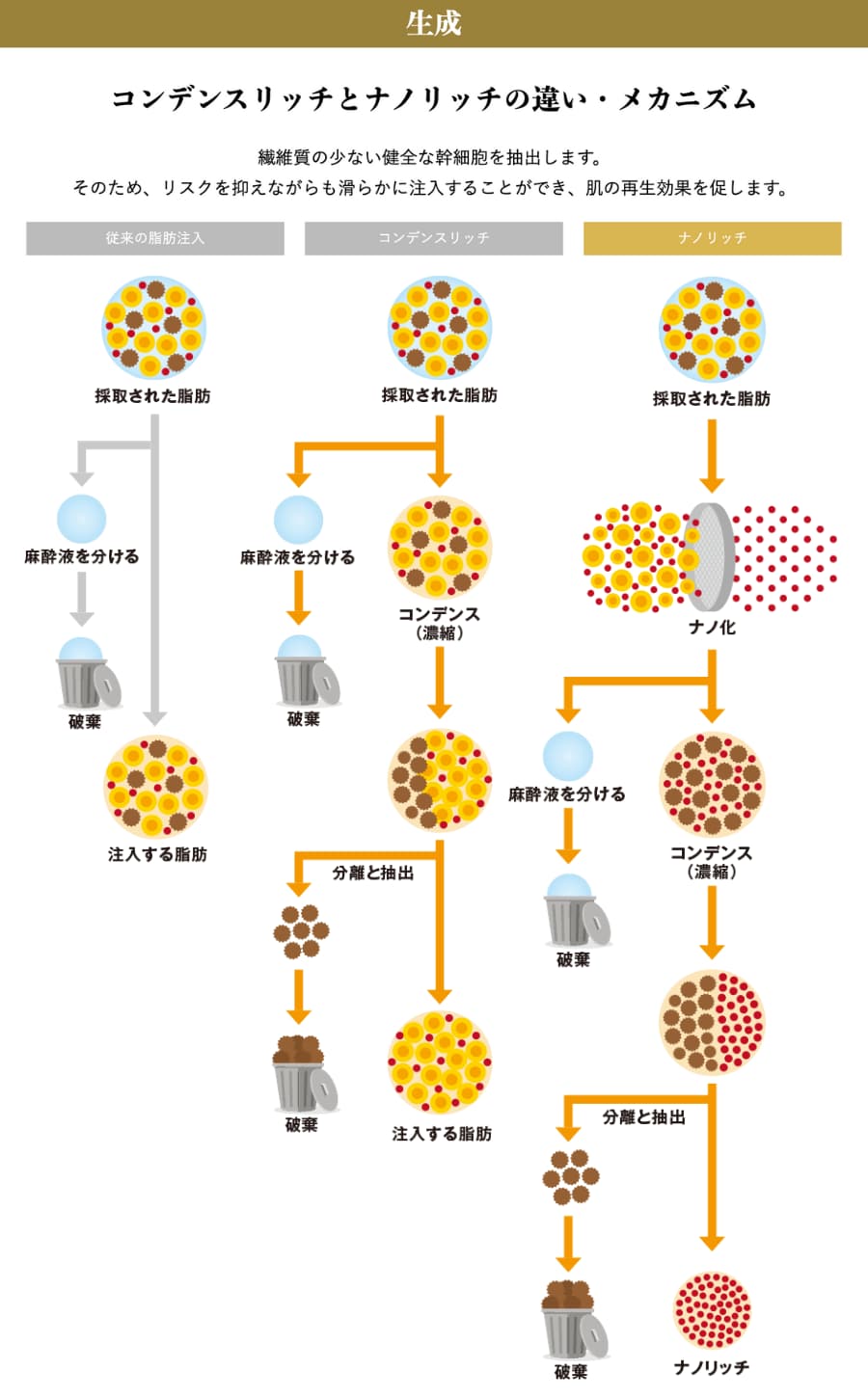 ナノリッチと近い施術に「コンデンスリッチ」がございますが、コンデンスリッチは肌の薄い箇所にはあまり適しておらず、目周りへの施術にはより安定性の高いナノリッチがおすすめです。