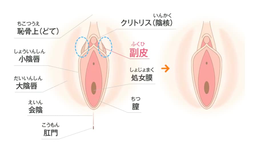 小陰唇の延長線上に見られることが多く、もともと副皮がない方もいらっしゃいます。