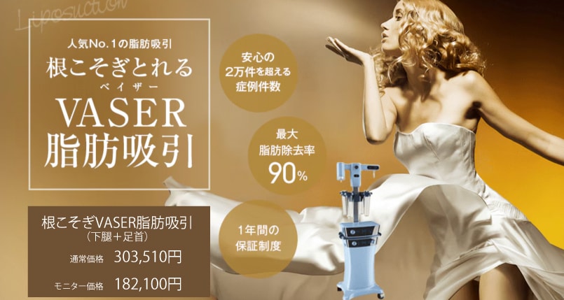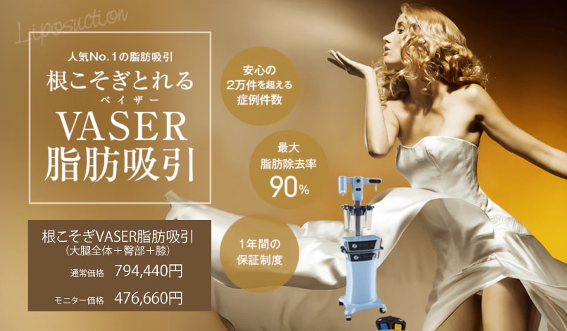 「ベイザー波」を用いて、脂肪のみを乳化し、根こそぎ吸引する施術です。「ベイザー波」は血管などの組織に影響しにくいため、術後のダウンタイム(腫れ・痛み)が少なく安全なのが特徴です。