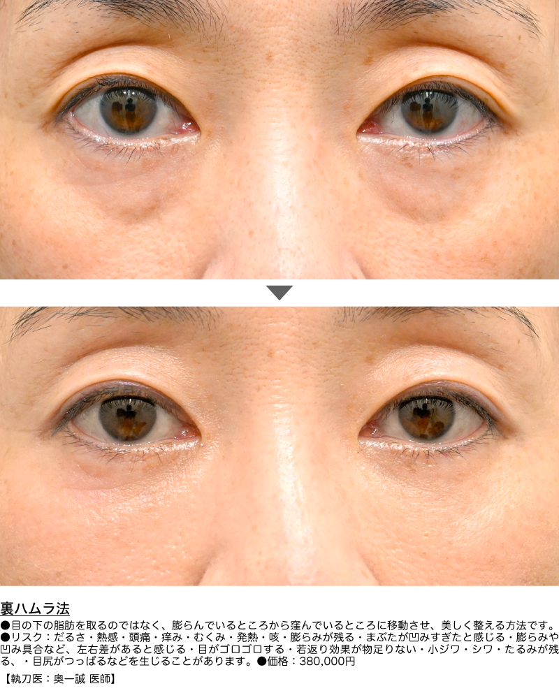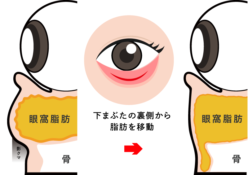 目の下のふくらみ(眼窩脂肪)を、脱脂せずに膨らんでいる部分から凹んでいる部分へ移動させることで、クマを改善します。下まぶたの裏側(結膜)からのアプローチにより、皮膚表面には傷跡が残りません。