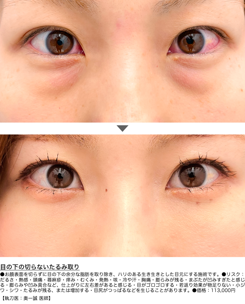 目の下のふくらみ(眼窩脂肪)を切らずに除去することで、クマを改善します。傷跡が残らず、腫れやダウンタイムも少ないです。ふくらみが軽度で、皮膚にハリがある方に特におすすめです。