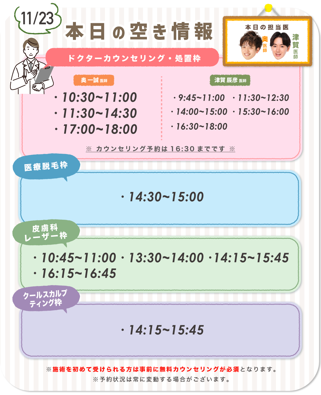 更に医療脱毛やシミ取りなどの医療レーザー治療、クールスカルプティングなどの痩身レーザーまで幅広い美容皮膚科治療もご案内可能です。