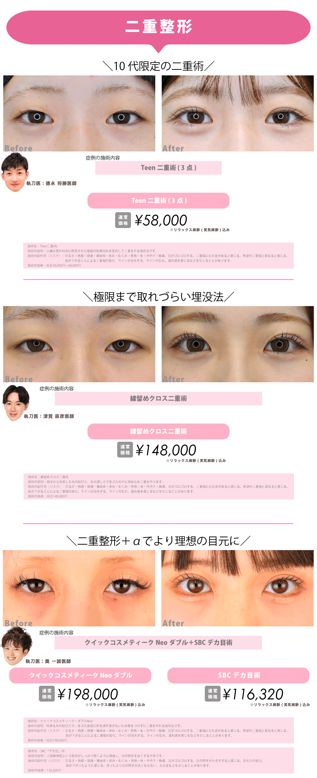 SBCメディカルグループでは、2018年6月1日に施行された医療広告ガイドラインを受け、ホームページ上からの体験談の削除を実施しました。また、症例写真を掲載する際には施術の説明、施術のリスク、施術の価格も表示させるようホームページを全面的に修正しております。当ホームページをご覧の患者様、お客様にはご迷惑、ご不便をおかけ致しますが、ご理解のほどよろしくお願い申し上げます。