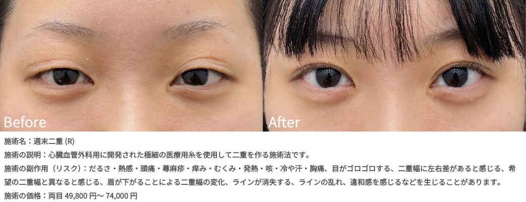 週末二重は、上まぶたの“瞼板”と呼ばれる部位にトライアングル形式で極細の医療用糸を留めて二重を形成する方法です。従来の埋没法に比べ術後の腫れが抑えられ、持ちも良いのが特徴です。