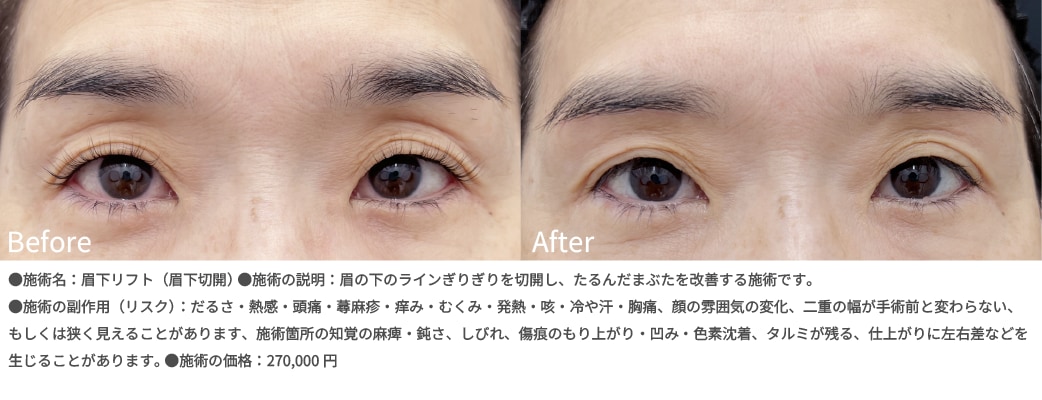 眉下リフトは、眉下のたるんだ皮膚を切開して引き上げる、たるみ改善の施術です。