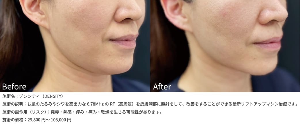 デンシティとは、高出力な6.78MHzのRF(高周波)を皮膚深部に照射をして、お肌のたるみやシワを改善をすることができる最新リフトアップマシン治療です。