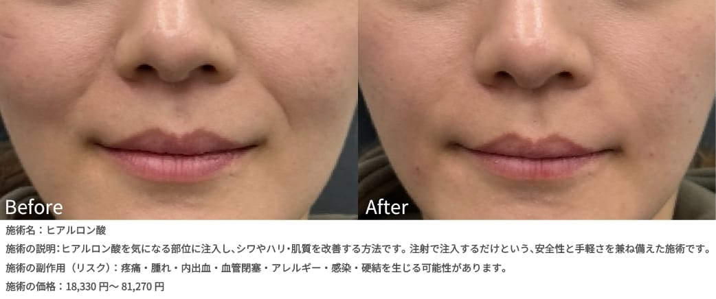 ヒアルロン酸注射は、元々体内にある成分のヒアルロン酸を注入して皮膚にボリュームを出し、ほうれい線やしわを改善する施術です。中でもジュビダームバイクロスシリーズは従来のヒアルロン酸よりも持続期間が長く、柔らかく滑らかなのが特徴です。