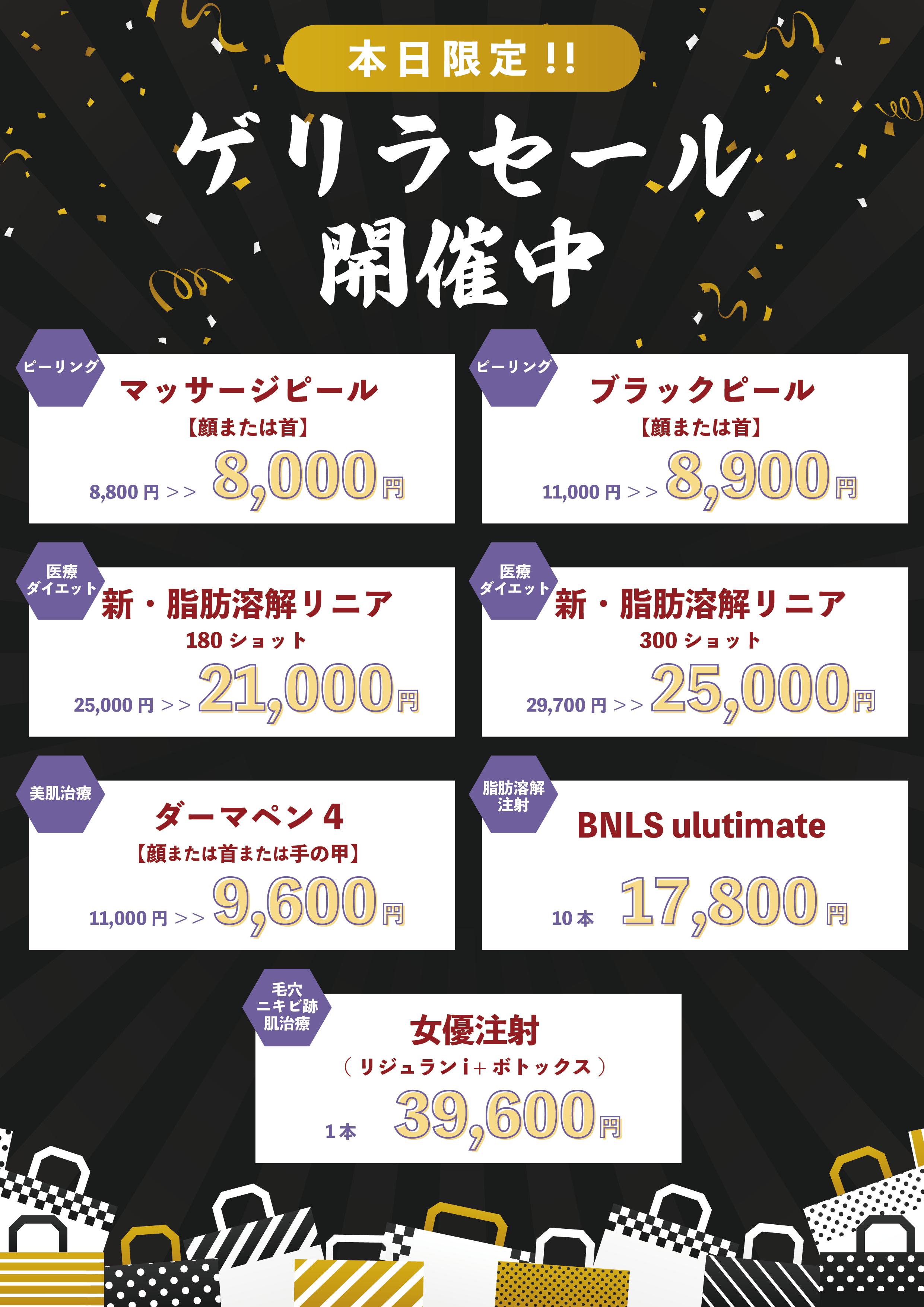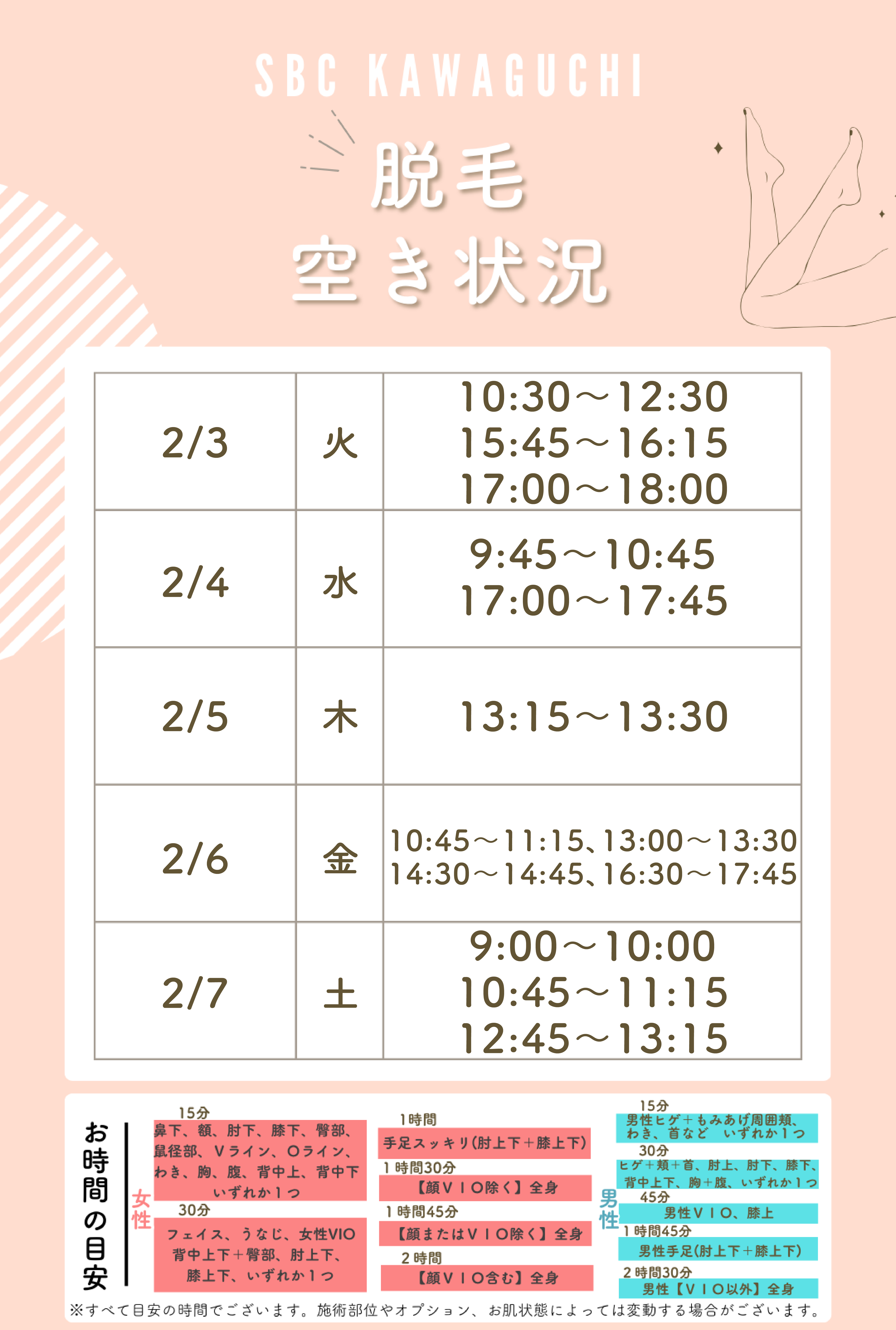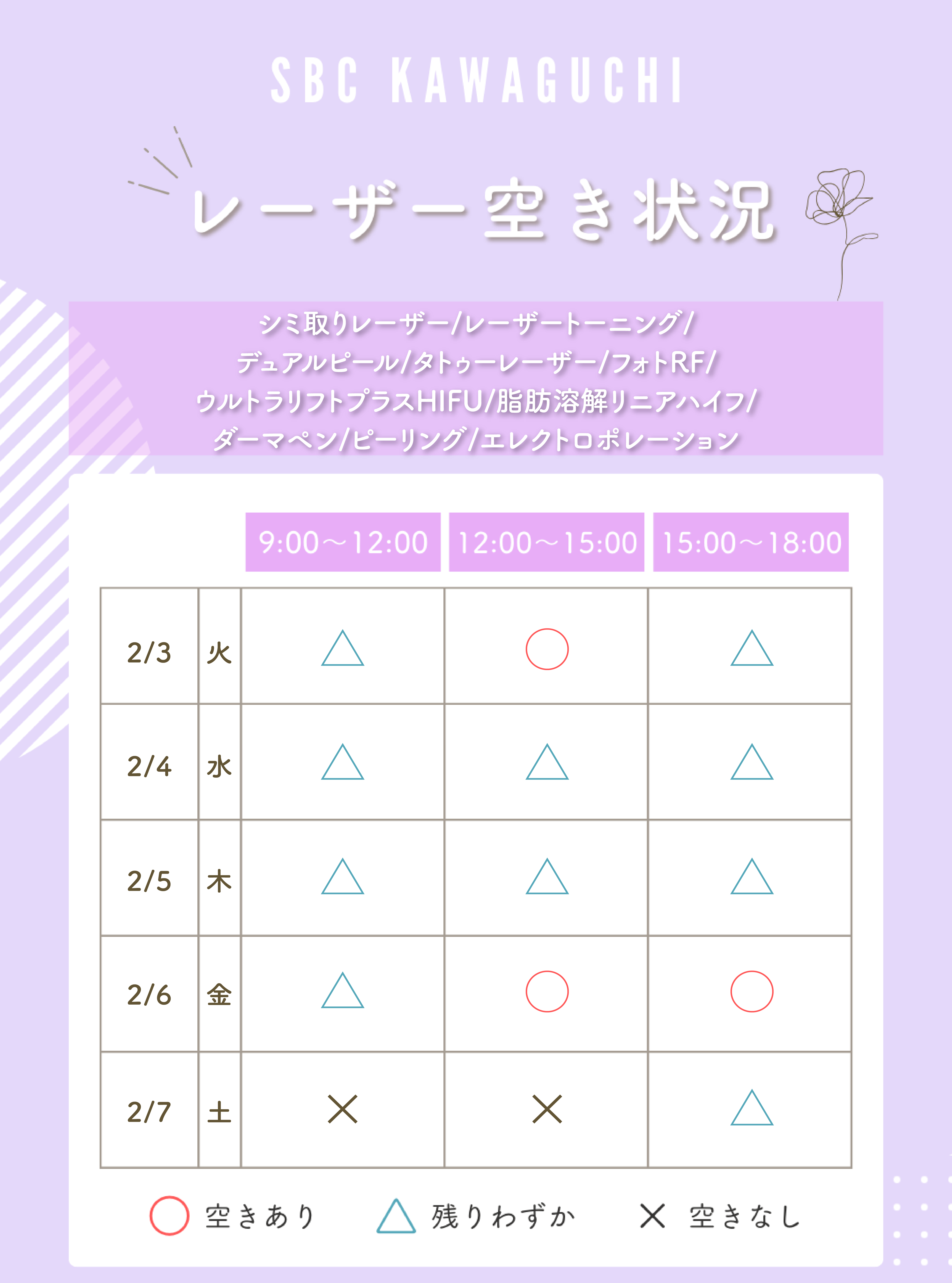また、しみ取り、医療ハイフ、ワキガ多汗症治療、医療脱毛、美容皮膚科などのSBC人気施術の取り扱いも多数ございます!