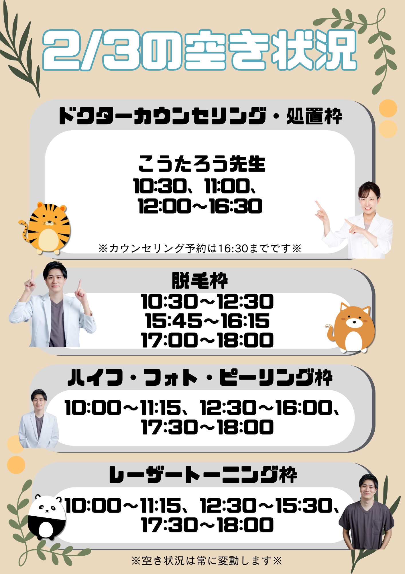 AM9:00~PM6:00 最終カウンセリング予約16:30まで ※休診日なし 土・日・祝日も対応 |