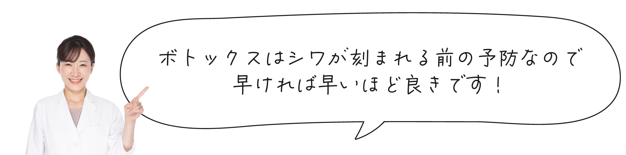 この表情を動かす“表情筋”に対して、ボトックス注射を注入することで、気になるシワをピタッと止め改善し、これからできるシワを予防する効果も期待できます。