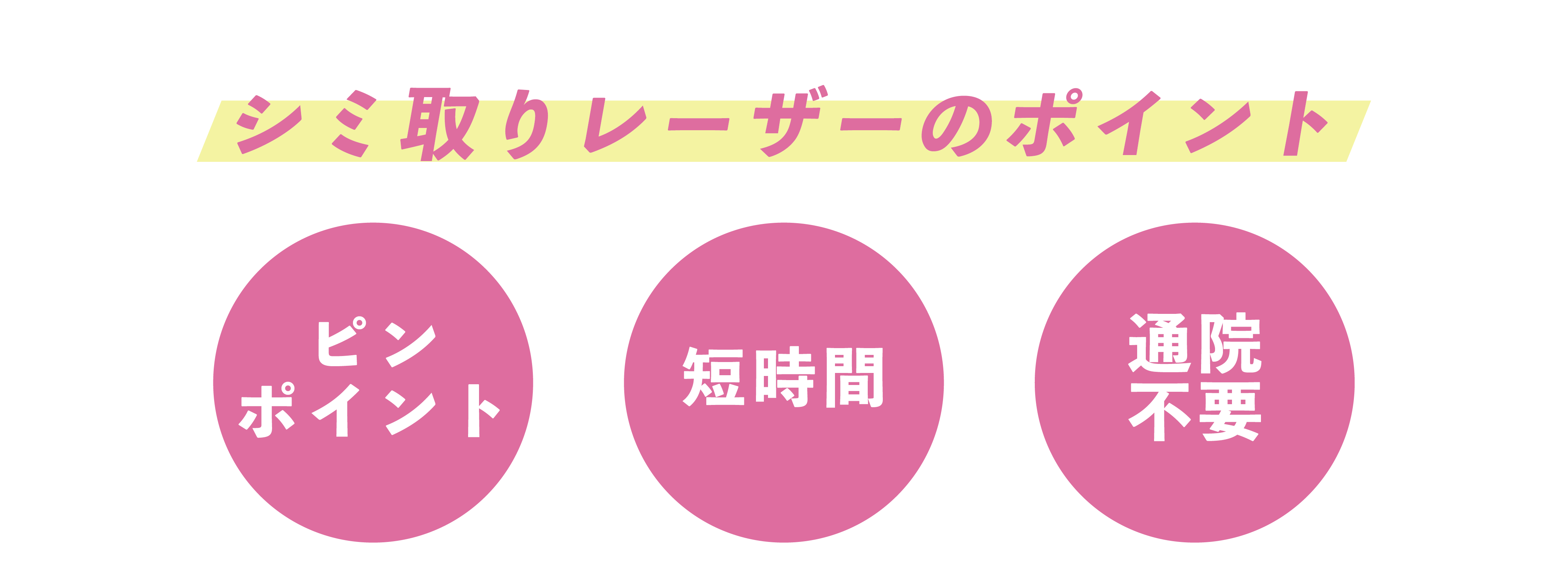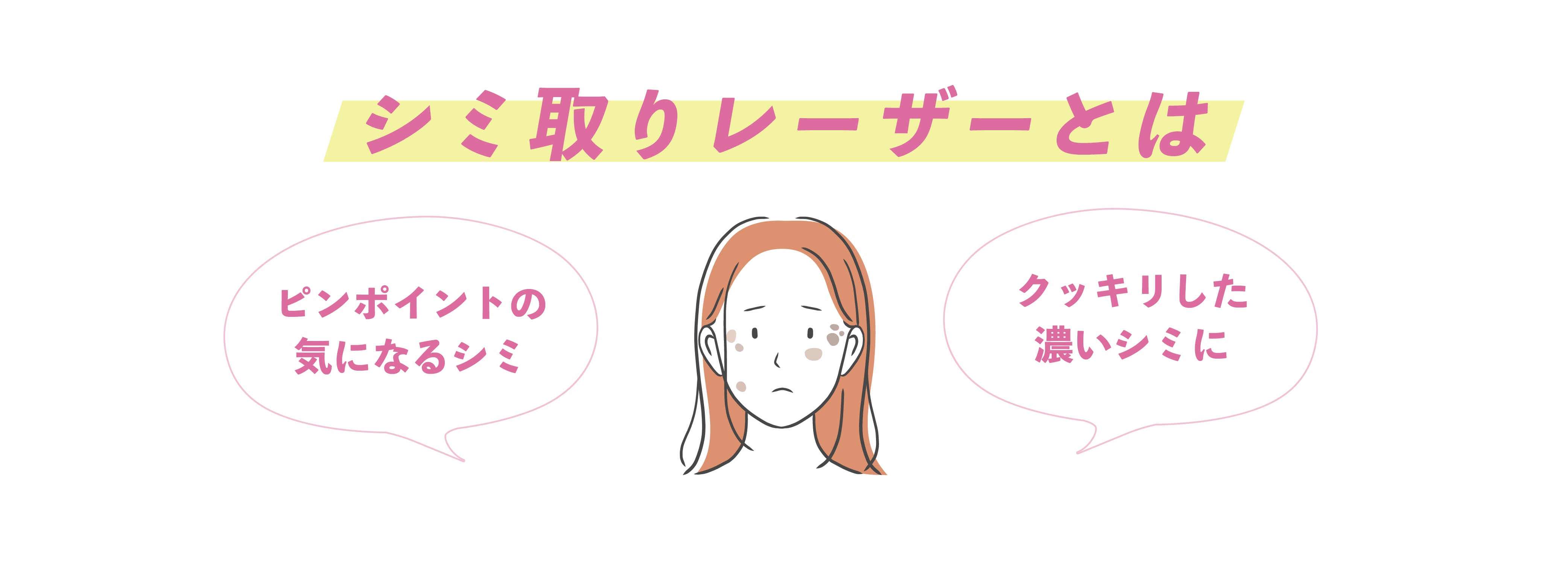 『シミ取りレーザー』とは、シミの原因である【メラニン】に反応するレーザーをピンポイントで照射することで、気になるシミを除去する治療です。シミの色素を破壊し自然な肌の色味に改善します。