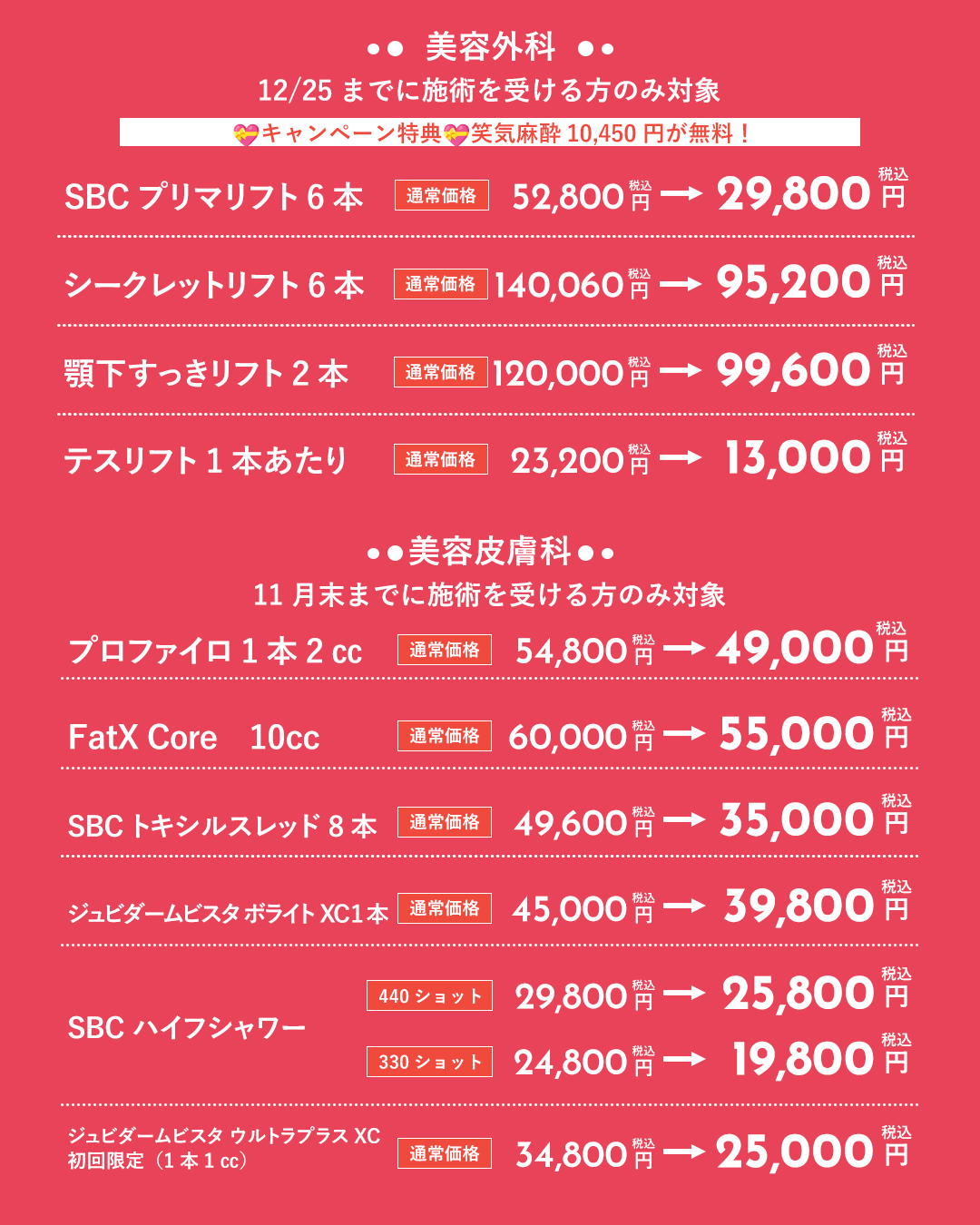 痩身、小顔治療、二重術、クマ取りなど幅広い施術を取り扱っております。