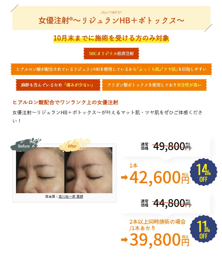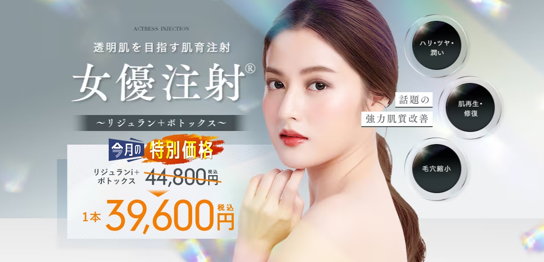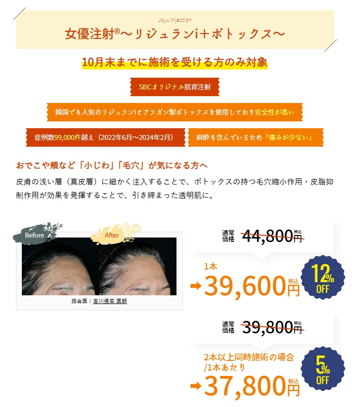 組織再生作用・抗炎症作用のある【リジュラン】と、真皮内に注入することで毛穴縮小や肌質改善効果のある【ボトックス】を掛け合わせたSBCオリジナル注射です。肌のハリ・ツヤが改善し、透明肌へ導きます。