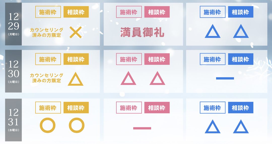 AM10:00~19:00 ※2026年1月2日よりAM:9:00~18:00 ※1月1日は全院休診 |