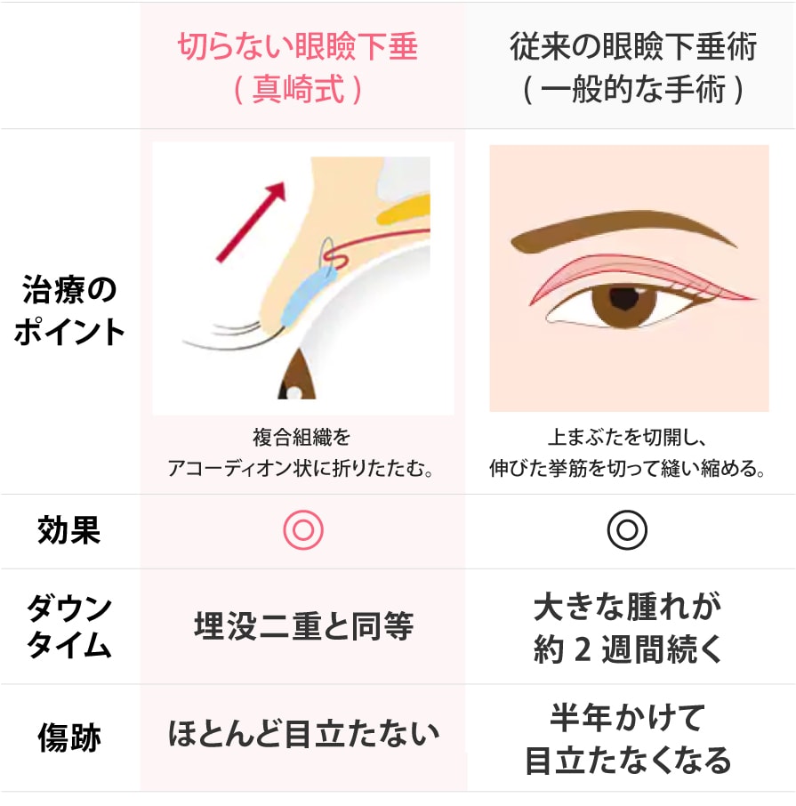 ※まぶたのたるみが非常に強い場合は、切開法が適していることがあります。※術後、一時的に軽度の腫れや内出血が生じる場合があります。※自由診療のため、公的医療保険は適用されません。