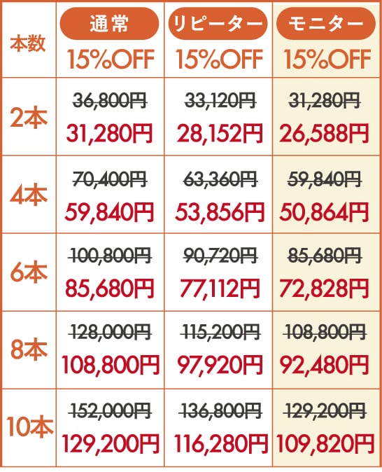 | 価格 | ・プリマリフト モニター価格 1本5,000円 ・プリマリフト 通常/リピーター価格 15%OFF ・VOV/シークレットリフト 通常/モニター/リピーター価格 15%OFF |