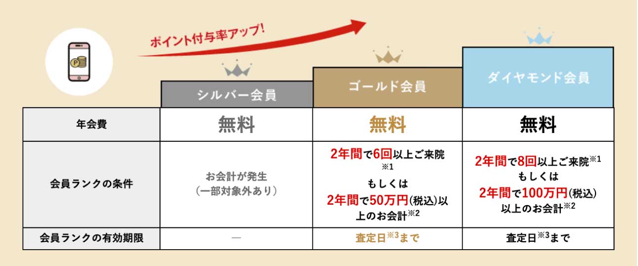 ※1【ご来院回数】ポイント・チケット値引き前のお会計額が3万円(税込)以上の場合、ご来院1回とカウントします。