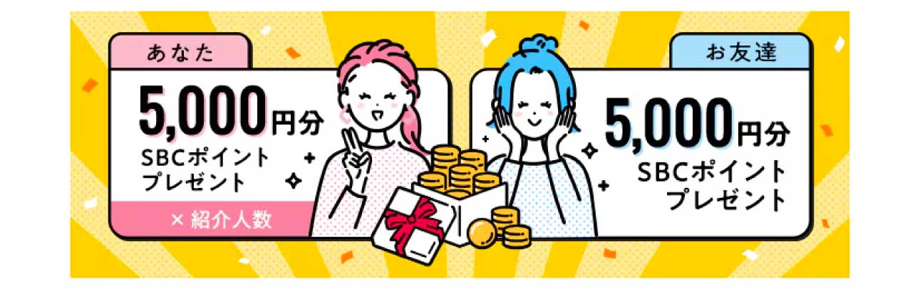 SBCメディカルグループにまだ来院したことがないお友達に当院をご紹介いただき、そのお友達が当院で施術を受けシルバー会員以上になると、ご紹介者様にもお友達にも5,000ポイントをプレゼント!