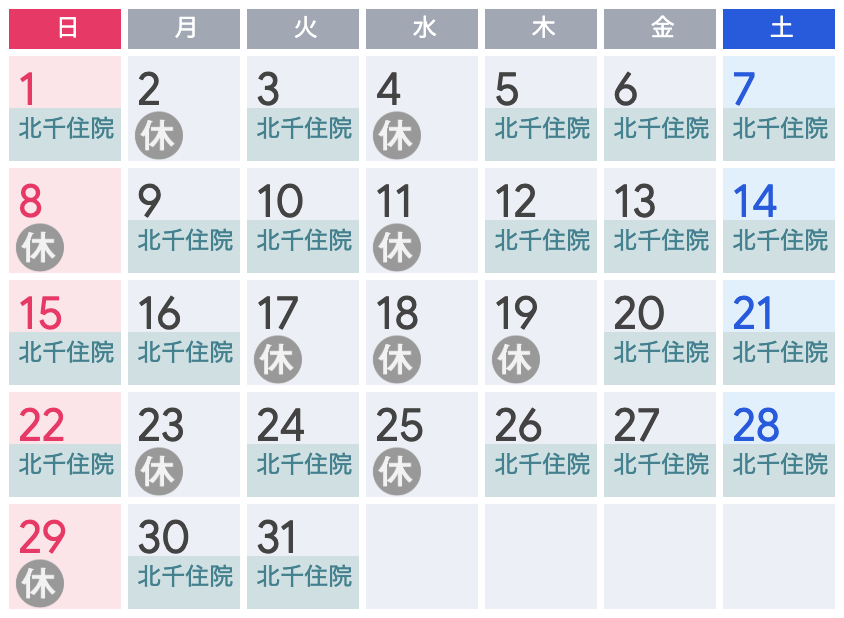 カレンダーを確認して、希望日に指名医師が出勤しているのかよくご確認ください。