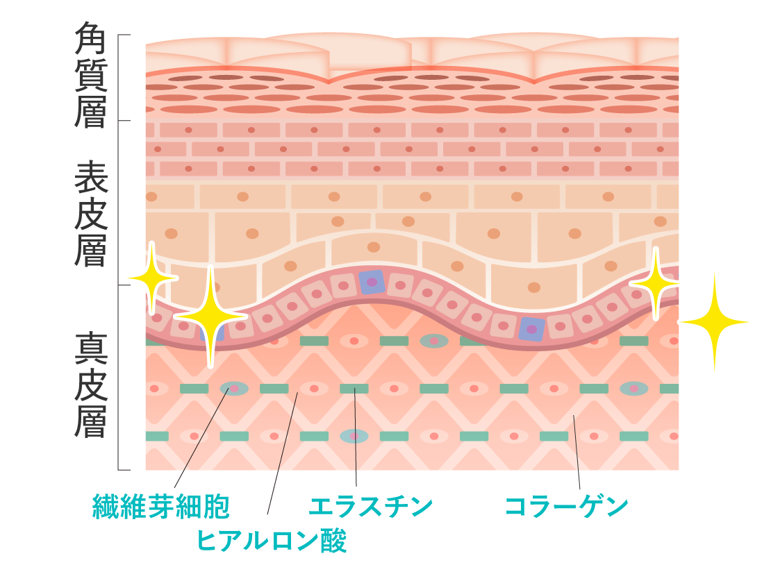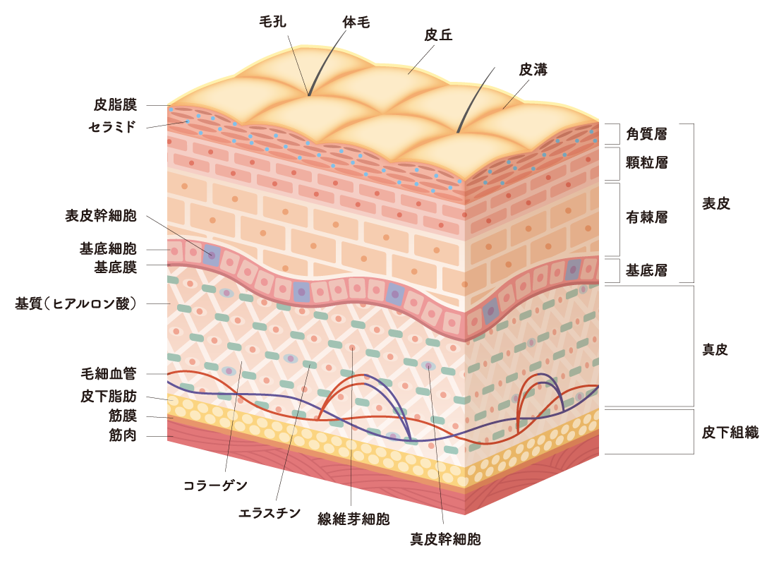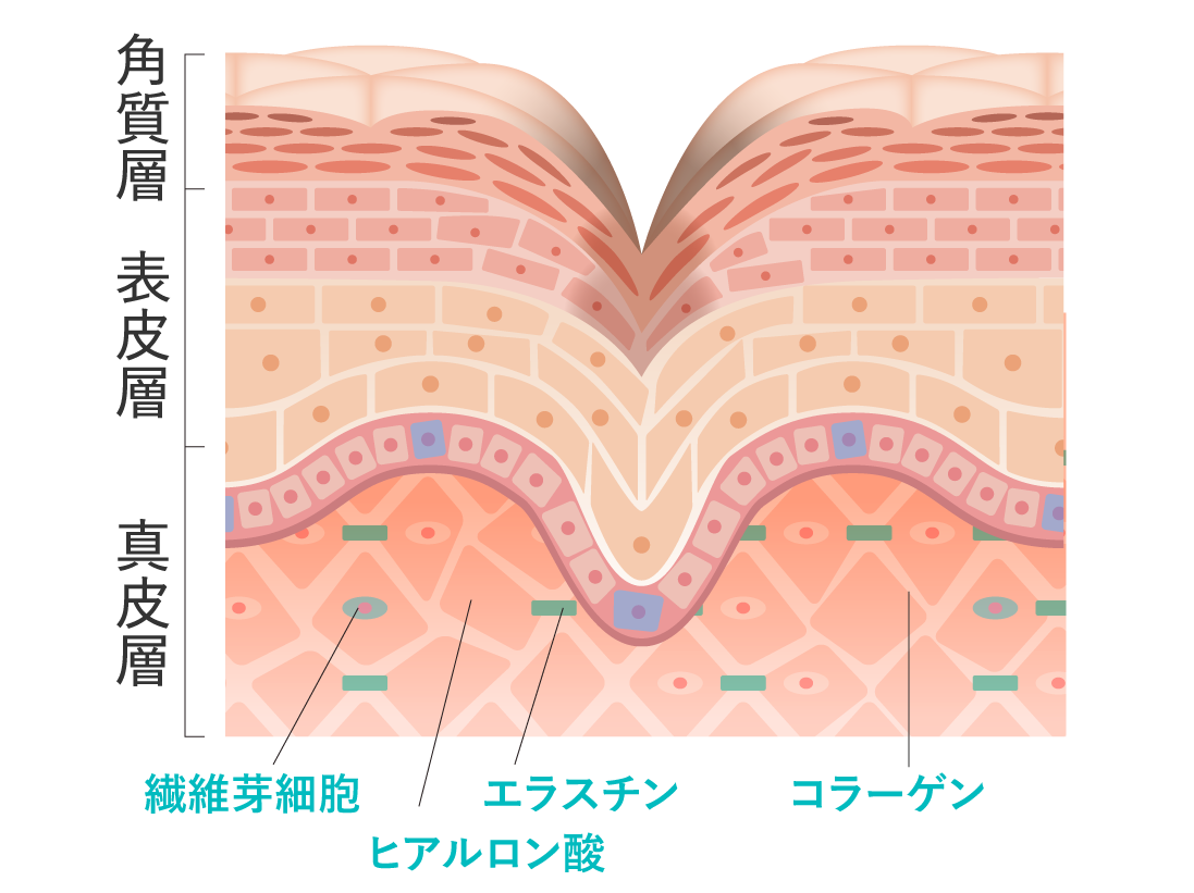 真皮の大部分を占めるコラーゲン繊維が強度を保ち、エラスチンが弾力を与え、ヒアルロン酸がそれらの隙間で水分を保持することで、肌のハリと弾力(弾力性)を維持します。