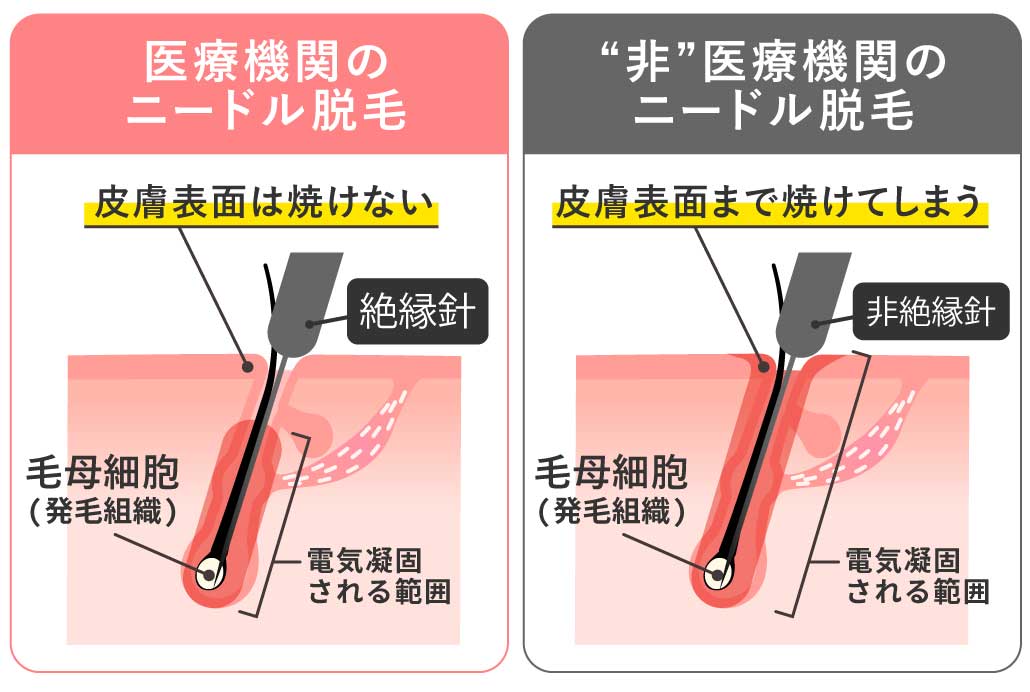 医師がいない非医療機関(エステ等)で行われる針脱毛は、法的に発毛組織を破壊することができません。そのため、無理な出力を出して火傷や感染症のリスクが高まる可能性があります。