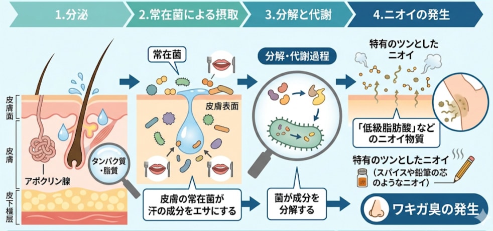 汗に含まれるエクリン線から出るよりタンパク質や脂質が多く含まれる汗になります。このタンパク質や脂質を、皮膚の常在菌がエサにして分解します。この分解過程で「低級脂肪酸」などのニオイ物質が発生し、特有のツンとしたニオイ(スパイスや鉛筆の芯のようなニオイ)になります。