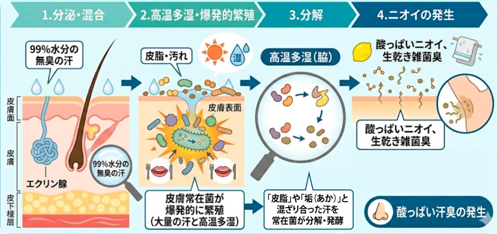 99%が水分の無臭の汗ですが、大量にかくと脇がムレます。放置すると汗が皮脂や汚れと混ざり合い、高温多湿の環境で菌が爆発的に繁殖。これらを分解することで、酸っぱいニオイや生乾きのような雑菌臭が発生します。