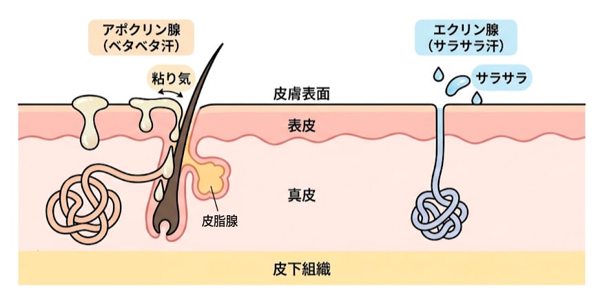 主に脇、陰部、乳首など限られた部位に存在し、思春期以降に性ホルモンの影響で活発になります。ここから出る汗には脂質やタンパク質が含まれており、少しベタつきがあるのが特徴です。ワキガ体質の方はこのアポクリン腺が多く、遺伝的な要因も強く影響します。