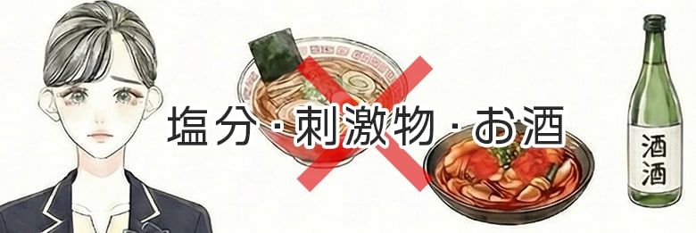 ラーメンやスナック菓子・塩辛いもの・キムチやカレーなどの刺激物・そしてアルコールは、ダウンタイム中にはできるだけ避けましょう。