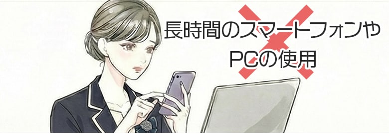 スマートフォンやPCの使用は控えめにし、目を休めることが重要です。スマートフォンなどの長時間使用は目の負担になり、腫れを長引かせたり、疲れ目やドライアイの原因になったりする可能性があります。