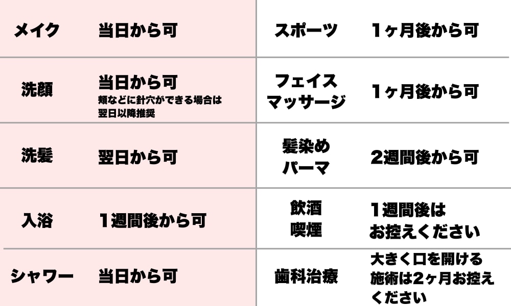 糸リフトの術後経過(目安表)