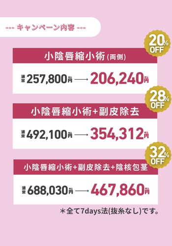 さらに、婦人科形成の抜糸は痛いと言われておりますが、今回のキャンペーンは、抜糸なしの「7days法」のみ!