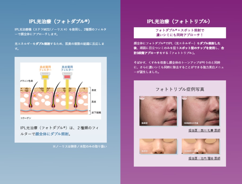 湘南のIPL光治療(フォトダブル®/フォトトリプル/フォトRF)は、厚生労働省認可の最新機器を使用し、化粧品では届かない肌の奥の色素に直接アプローチします。