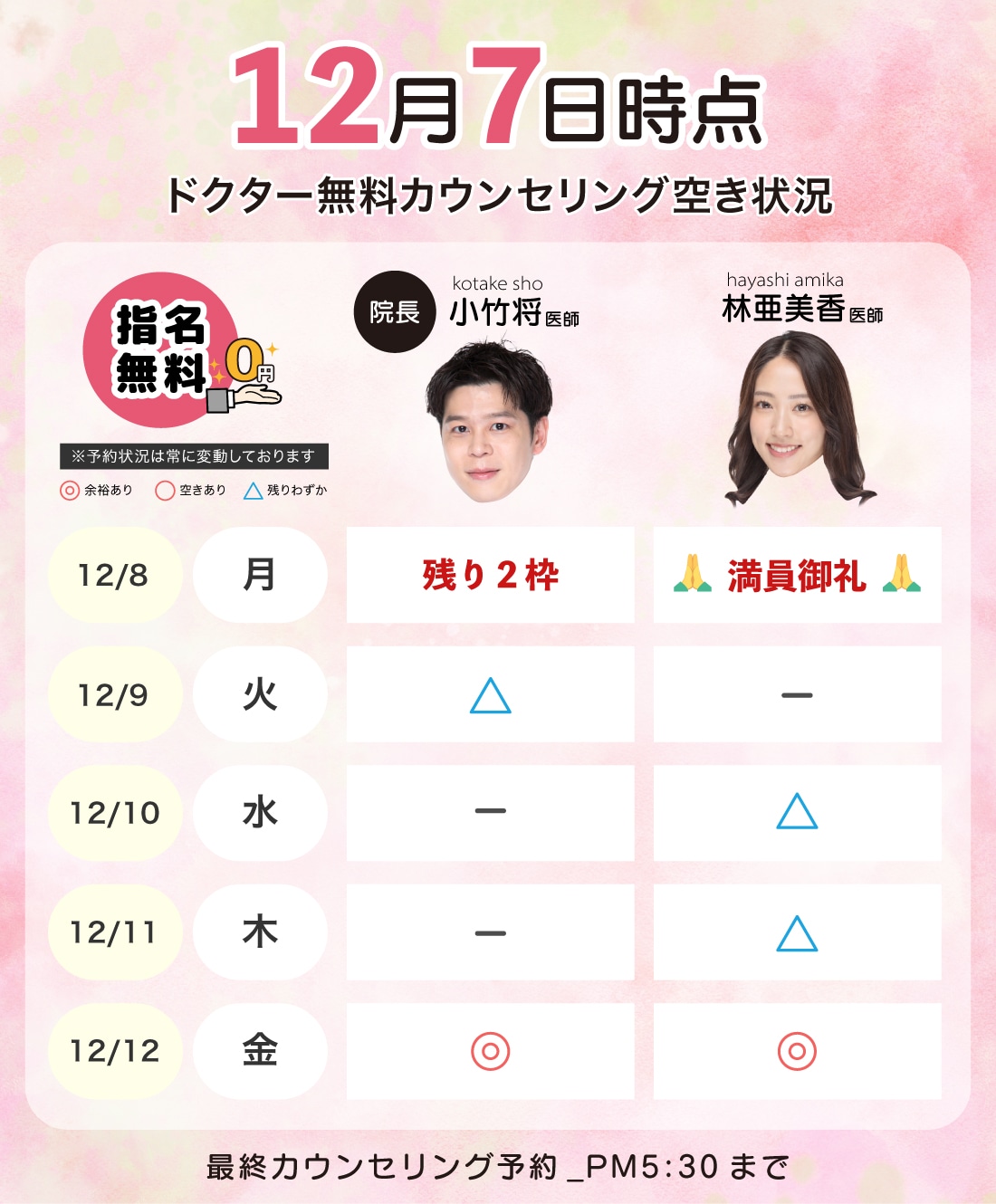 AM10:00~PM7:00(最終カウンセリング予約PM5:30まで) ※休診日:元旦のみ |