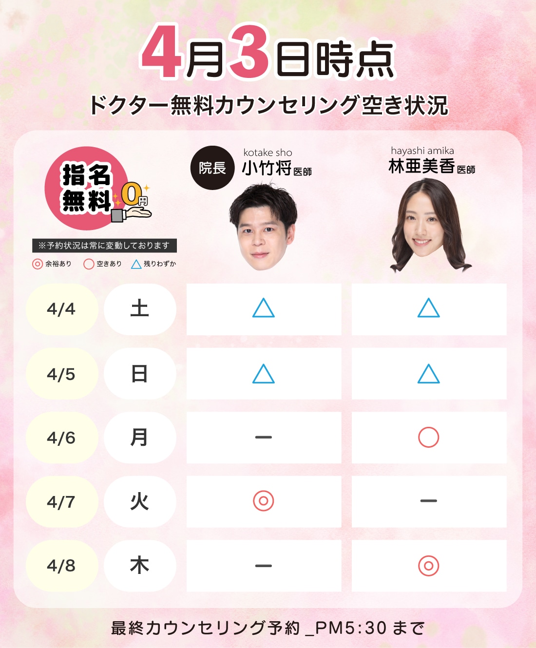 AM10:00~PM7:00(最終カウンセリング予約PM5:30まで) ※休診日:元旦のみ |