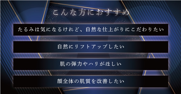 肌全体の構造を整えることで、ハリ・弾力・潤いを内側から回復させ、シワやたるみを 根本から改善し健康的で若々しい肌へと導きます。