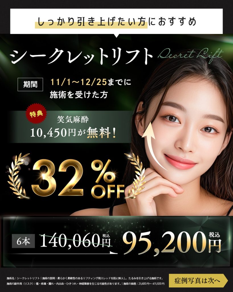 そんな想いを込めて、当院で大人気の糸リフト2種類を、大変お得な価格でご用意いたしました!