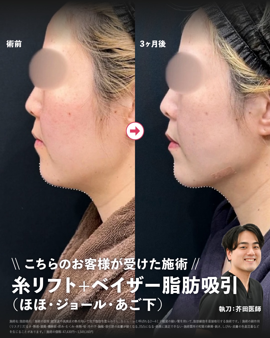 また、脂肪吸引後は皮膚が動きやすい状態になるため、糸リフトを単体で行うよりもリフトアップ効果が大きくなります✨
