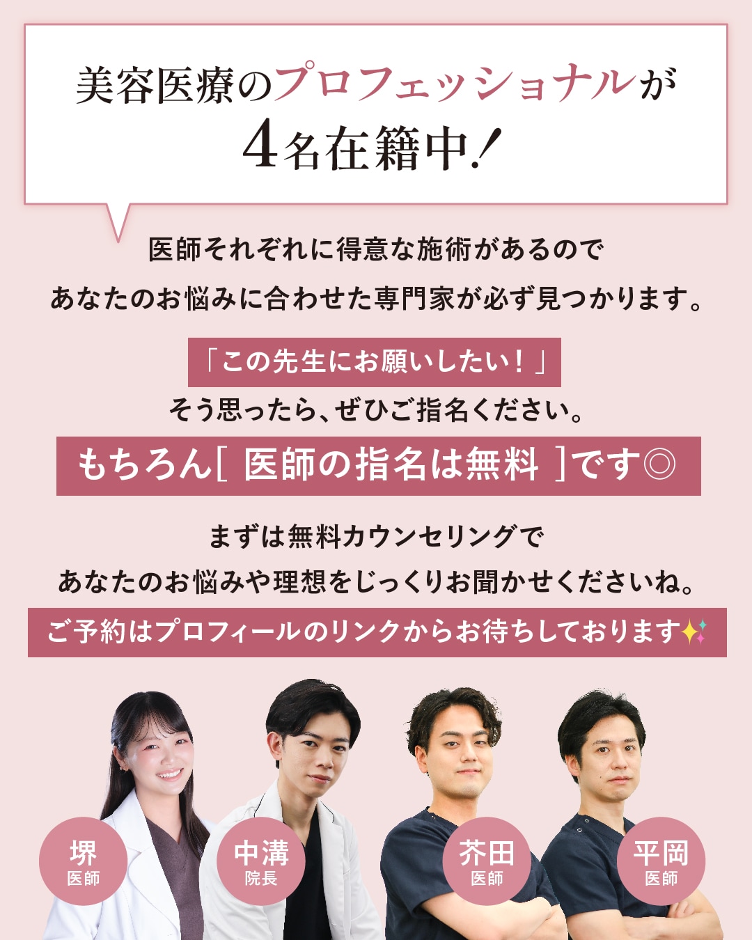 経験豊富なドクターと親身なスタッフが、あなたの「なりたい姿」を叶えるために、最適な治療法をご提案いたします。まずはお気軽に無料カウンセリングへお越しください✨