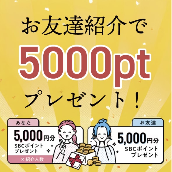 SBCメディカルグループにまだ来院したことがないお友達に当院をご紹介いただき、そのお友達が当院で施術を受けシルバー会員以上になると、ご紹介者様にもお友達にも5,000ポイントをプレゼント!